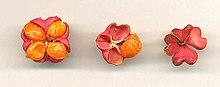 The inconspicuous flowers occur in small groups, and can be green, yellow, pink or maroon in color depending on species.[4] The leaves are opposite (rarely alternate) and simple ovoid, typically 2–15 cm long, and usually with a finely serrated margin. The fruit is a pink or white four- or five-valved pod-like berry, which splits open to reveal the fleshy-coated orange or red seeds.