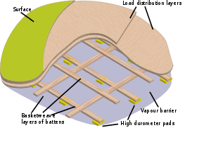 A semi-traditional floor would have wood battens laid on pads made of neoprene, which is more durable than rubber. Pads are typically laid 40–50 cm (16–20 in) apart and are 1–2.5 cm (0.39–0.98 in) thick. Then more wood battens are put on top at right angles, halfway between the pads. A traditional floor might have three layers of this springing. Then two layers of plywood are placed on top, offset by 45–90 degrees so that the joints do not match up. The plywood spreads the load. Finally, the actual surface is made from a layer of strong, durable wood like oak, beech or maple, or other types of wood that are covered with a vinyl surface. There may also be provision to prevent the floor from depressing too much if a very heavy weight is placed on it.