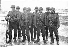 During World War 2 the German Wehrmacht infantry squad or Gruppe was mainly a general purpose machine gun (GPMG) based unit. The advantage of the general purpose machine gun concept was that it added greatly to the overall volume of fire that could be put out by a squad-sized unit. The MG 34 or MG 42 GPMGs were normally used in the light machine gun role. An infantry Gruppe consisted of ten men; a non-commissioned officer or Unteroffizier squad leader, deputy squad leader, a three-man machine gun team (machine gunner, assistant gunner and ammunition carrier) and five riflemen. As personal small arms the squad leader was issued a rifle or as of around 1941 a submachine gun, the machine gunner and his assistant were issued pistols and the deputy squad leader, ammunition carrier and the riflemen were issued rifles. The riflemen carried additional ammunition, hand grenades, explosive charges or a machine gun tripod as required and provided security and covering fire for the machine gun team.[4][5] Two of the standard issue bolt-action Karabiner 98k rifles in the squad could be replaced with semi-automatic Gewehr 43 rifles and occasionally, StG-44 assault rifles could be used to re-arm the whole squad, besides the machine-gun.