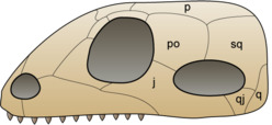 In most tetrapods, the squamosal and quadratojugal bones form the cheek series of the skull.[2] The bone forms an ancestral component of the dermal roof and is typically thin compared to other skull bones.[3]