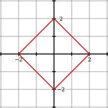 specifies the boundary of this square. This equation means "x2 or y2, whichever is larger, equals 1." The circumradius of this square (the radius of a circle drawn through the square's vertices) is half the square's diagonal, and is equal to Then the circumcircle has the equation