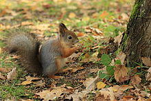 Red squirrel in the Seurasaari island in Helsinki, Finland. The almost domesticated red squirrels on that island have become accustomed to humans thanks to their long-term feeding.[23]
