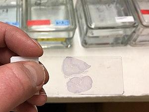 Fixation–which may itself consist of several steps–aims to preserve the shape of the cells or tissue involved as much as possible. Sometimes heat fixation is used to kill, adhere, and alter the specimen so it accepts stains. Most chemical fixatives (chemicals causing fixation) generate chemical bonds between proteins and other substances within the sample, increasing their rigidity. Common fixatives include formaldehyde, ethanol, methanol, and/or picric acid. Pieces of tissue may be embedded in paraffin wax to increase their mechanical strength and stability and to make them easier to cut into thin slices.[2]Mordant: These are chemical agents which have power of making dyes to stain materials which otherwise are unstainable