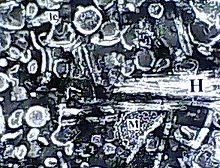 Haematoxylin (hematoxylin in North America) is a nuclear stain.[10] Used with a mordant, haematoxylin stains nuclei blue-violet or brown.[10] It is most often used with eosin in the H&E stain (haematoxylin and eosin) staining, one of the most common procedures in histology.[10]