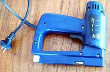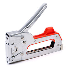 A staple gun or powered stapler is a hand-held machine used to drive heavy metal staples into wood, plastic, or masonry. Staple guns are used for many different applications and to affix a variety of materials, including insulation, house wrap, roofing, wiring, carpeting, upholstery, and hobby and craft materials. These devices are also known as trigger tackers.[1]