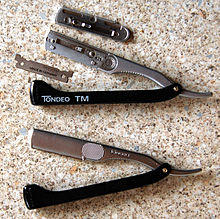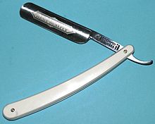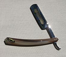 A straight razor is a razor with a blade that can fold into its handle.[1][2] They are also called open razors and cut-throat razors.[3][4][5] The predecessors of the modern straight razors include bronze razors, with cutting edges and fixed handles, produced by craftsmen from Ancient Egypt during the New Kingdom (1569 — 1081 BC). Solid gold and copper razors were also found in Ancient Egyptian tombs dating back to the 4th millennium BC.