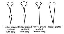 The second category refers to the type of grinding method used and, since it affects the curvature of the blade cross section, includes the following two main types of blade grinds: