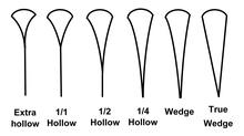 A hollow grind produces a thinner blade than the flat grind because it removes more material from the blade (hollows or thins the blade more). The hollow-ground blade flexes more easily and provides more feedback on the resistance the blade meets while cutting the hair, which is an indicator of blade sharpness.[13][43] Hollow-ground blades are preferred by most barbers and some high-end razor manufacturers limit their production exclusively to hollow ground razors.[19][13]