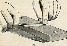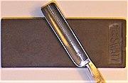 The stropping process involves sliding the razor blade flat on the strop; upon reaching the end of the cloth or leather near the suspension ring, the blade is turned about its back (clockwise for a right-handed barber; counter-clockwise for a left-handed one) until the cutting edge touches the strop. It is then pulled toward the rectangular handle of the strop with back and cutting edge flat on the strop as before. The blade is moved in a slightly diagonal direction so to give every point of the edge a chance to touch the strop, without applying too much pressure. This process aligns the cutting edge properly with the back of the blade, avoiding "bumps" on the cutting edge. Rotating the blade on the strop about the cutting edge can damage it because such use will impact the micro-alignment of the edge.[45] Depending on use and condition, the blade can be sharpened occasionally by using a razor hone.[48][49] Strops prepared with pastes containing fine grit are also used for honing but are not recommended for the inexperienced user, as they can easily rake off the edge if they apply the wrong amount or exert too much pressure.[34][50]