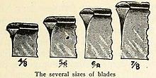 The third and final category refers to blade width. The width of the blade is defined as the distance between the back of the blade and the cutting edge. It is expressed in units of eighth of an inch.[25] The sizes vary from 3&fras1;8 in (9.5 mm) up to 7&fras1;8 in (22 mm), rarely 8&fras1;8 in (25 mm).[25] A wider blade can carry more lather, much like a scoop, during multiple successive shaving strokes and thus it allows the user more shaving time and minimises blade rinse cycles. The disadvantage of the wider blade is that it is not as manoeuvrable as a narrower blade. A narrow blade can shave tight facial spots such as under the nose, but it must be rinsed more often. The most popular blade width size is 5&fras1;8 in (16 mm).[25] The width of the blade can also affect its sharpness. The wider the blade, the greater the thermal deformation that can occur due to changing temperatures, a fact that can lead to loss of edge sharpness.[21]