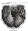 Dura mater and its processes exposed by removing part of the right half of the skull, and the brain. (Straight sinus visible as blue line at center left.) | |