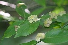 This is a deciduous shrub growing up to 2 metres (6 ft 7 in) tall. The oppositely arranged leaves are leathery or papery in texture and measure up to 10 cm (3.9 in) long. Flowers are borne in the leaf axils on peduncles up to 2.2 cm (0.87 in) long. The yellow-green sepals are 1 or 2 cm (0.39 or 0.79 in) long and the greenish or reddish petals above are smaller. The fruit capsule is about 1.5 cm (0.59 in) wide with a red warty or spiny covering. The capsule splits into five sections, revealing seeds covered in bright red arils.[3]