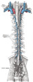 The thyroid gland and its relations. (Right subclavian vein visible at bottom left, left subclavian vein visible at bottom right.) | |