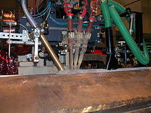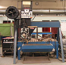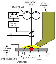 Submerged arc welding (SAW) is a common arc welding process. The first SAW patent was taken out in 1935. The process requires a continuously fed consumable solid or tubular (metal cored) electrode.[1] The molten weld and the arc zone are protected from atmospheric contamination by being "submerged" under a blanket of granular fusible flux consisting of lime, silica, manganese oxide, calcium fluoride, and other compounds. When molten, the flux becomes conductive, and provides a current path between the electrode and the work. This thick layer of flux completely covers the molten metal thus preventing spatter and sparks as well as suppressing the intense ultraviolet radiation and fumes that are a part of the shielded metal arc welding (SMAW) process.