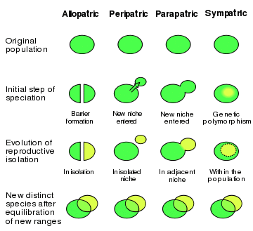 Four main types of population pairs exist in nature. Sympatric populations (or species) contrast with parapatric populations, which contact one another in adjacent but not shared ranges and do not interbreed; peripatric species, which are separated only by areas in which neither organism occurs; and allopatric species, which occur in entirely distinct ranges that are neither adjacent nor overlapping.[3] Allopatric populations isolated from one another by geographical factors (e.g., mountain ranges or bodies of water) may experience genetic—and, ultimately, phenotypic—changes in response to their varying environments. These may drive allopatric speciation, which is arguably the dominant mode of speciation.
