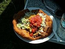 Indian tacos, or Navajo tacos, are made using frybread instead of tortillas. They are commonly eaten at pow-wows, festivals, and other gatherings by and for indigenous people in the United States and Canada.[24][25]