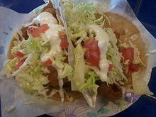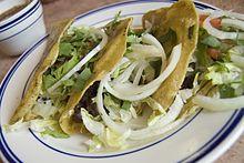 The hard-shell or crispy taco is a tradition that developed in the United States. The most common type of taco in the US is the hard-shell, U-shaped version, first described in a cookbook in 1949.[14] This type of taco is typically served as a crisp-fried corn tortilla filled with seasoned ground beef, cheese, lettuce, and sometimes tomato, onion, salsa, sour cream, and avocado or guacamole.[15] Such tacos are sold by restaurants and by fast food chains, while kits are readily available in most supermarkets. Hard shell tacos are sometimes known as tacos dorados ("golden tacos") in Spanish,[16] a name that they share with taquitos.