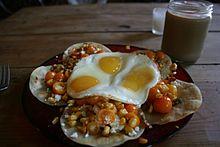 The breakfast taco, found in Tex-Mex cuisine, is a soft corn or flour tortilla filled with meat, eggs, or cheese, and can also contain other ingredients.[21] Some have claimed that Austin, Texas is the home of the breakfast taco.[22] However, food writer and OC Weekly editor Gustavo Arellano responded that such a statement reflects a common trend of "whitewashed" foodways reporting, noting that predominantly Hispanic San Antonio, Texas "never had to brag about its breakfast taco love—folks there just call it 'breakfast'".[23]