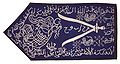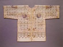 This shirt is an example of the Islamic tradition of Talismanic shirts or jama.[7] It dates from the 15th-early 16th century, attributed to Northern India or Deccan, and consists of cotton, ink and gold.[17] Its surface is decorated with painted squares, medallions, and lappet-shaped sections with the entire Qur'an written inside; these areas are bordered by the ninety-nine names of God written in gold against an orange background.[17] A panel at the center of the reverse contains a proclamation in gold script stating, "God is the Merciful, the Compassionate."[17] These references recognise God's power and request his assistance in times of trouble, and so it may have been worn under armour to provide protection in battle.[7][17]