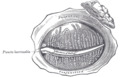 Anatomists divide the gland into two sections, a palpebral lobe, or portion, and an orbital lobe or portion.[3] The smaller palpebral lobe lies close to the eye, along the inner surface of the eyelid; if the upper eyelid is everted, the palpebral portion can be seen.