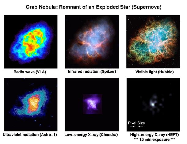 Six views of the Crab nebula supernova remnant, viewed at different wavelengths of light by various telescopes