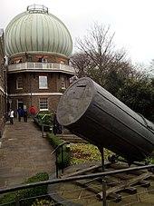 The "onion" dome at the Royal Observatory, Greenwich housing a 28-inch refracting telescope with a remaining segment of William Herschel's 120-centimetre (47 in) diameter reflecting telescope (called the "40-foot telescope" due to its focal length) in the foreground.