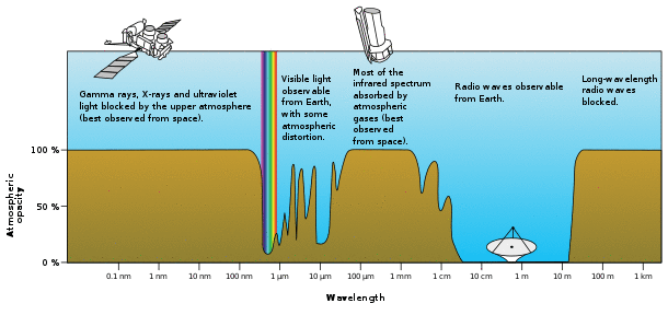 Since the atmosphere is opaque for most of the electromagnetic spectrum, only a few bands can be observed from the Earth's surface. These bands are visible – near-infrared and a portion of the radio-wave part of the spectrum. For this reason there are no X-ray or far-infrared ground-based telescopes as these have to be observed from orbit. Even if a wavelength is observable from the ground, it might still be advantageous to place a telescope on a satellite due to astronomical seeing.