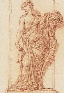 In Greek mythology, Terpsichore (/tərpˈsɪkəriː/; Τερψιχόρη, "delight in dancing") is one of the nine Muses and goddess of dance and chorus.[1] She lends her name to the word "terpsichorean" which means "of or relating to dance". She is usually depicted sitting down, holding a lyre, accompanying the dancers' choirs with her music. Her name comes from the Greek words τέρπω ("delight") and χoρός ("dance"). She was also said to be the mother of the Sirens and Parthenope by Achelous. In some accounts, she bore the Thracian king Biston by Ares.[2]