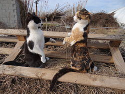 Territorial scent marking may involve behaviours specific to this activity. When a wolf marks its territory, it lifts a hind leg and urinates on a scent post (usually an elevated position like a tree, rock, or bush).[18] This raised leg urination is different from normal urination, which is done while squatting. This posture is exclusive to alpha wolves of either sex, although the alpha male does this most often. The alpha female usually urinates on a scent post that her breeding partner has just urinated on, although during the mating season, the female may first urinate on the ground. All other females in the pack, and also young wolves and low-ranking male wolves, urinate while squatting.[19] Males and female ring-tailed lemurs (Lemur catta) scent-mark both vertical and horizontal surfaces at the overlaps in their home ranges using their anogenital scent glands. To do this, they perform a handstand to mark vertical surfaces, grasping the highest point with their feet while applying the scent.[20]