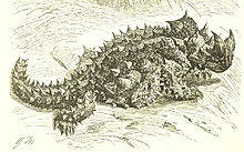 The thorny devil was first described by the biologist John Edward Gray in 1841. While it is the only species contained in the genus Moloch, many taxonomists suspect another species might remain to be found in the wild.[1] The thorny devil is only distantly related to the morphologically similar North American horned lizards of the genus Phrynosoma. This similarity is usually thought of as an example of convergent evolution.