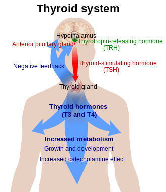 - ^ Mullur R, Liu YY, Brent GA (April 2014). "Thyroid hormone regulation of metabolism". Physiological Reviews. 94 (2): 355–382. doi:10.1152/physrev.00030.2013. PMC 4044302. PMID 24692351.