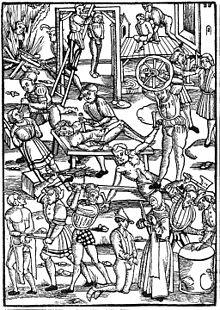 Medieval and early modern European courts used torture, depending on the crime of the accused and his or her social status. Torture was deemed a legitimate means to extract confessions or to obtain the names of accomplices or other information about a crime, although many confessions were greatly invalid due to the victim being forced to confess under great agony and pressure. It was permitted by law only if there was already half-proof against the accused.[31] Torture was used in continental Europe to obtain corroborating evidence in the form of a confession when other evidence already existed.[32] Often, defendants already sentenced to death would be tortured to force them to disclose the names of accomplices. Torture in the Medieval Inquisition began in 1252 with a papal bull Ad Extirpanda and ended in 1816 when another papal bull forbade its use.