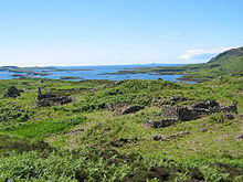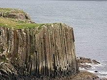 Ulva's interior is moorland, while the spectacular geological formations of the south coast, have been somewhat overshadowed by those of its neighbour Staffa. Nonetheless, they are still renowned in their own right.[2] Around 60 million years ago, the region was volcanically active, with Ben More on Mull being the remnant of a volcano, and it was in this period that the famous rock formations of Staffa and the basaltic columns of "The Castles" on Ulva came into being.[13] The lava flows are known as the "Staffa Magma Type member" and can also be seen on Mull at Carsaig, Ardtum, and near Tobermory on its east coast. They are particularly rich in silica.[14] These were formed when the cooling surface of the mass of hot lava cracked in a hexagonal pattern in a similar way to drying mud cracking as it shrinks, and these cracks gradually extended down into the mass of lava as it cooled and shrank to form the columns which were subsequently exposed by erosion.[15]