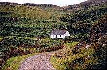 "Sheila's Cottage" is a thatched but and ben, which was restored in the 1990s. It is named for Sheila MacFadyen (Sile NicPhaidein), who lived in the cottage between the turn of the 20th century and the early 1950s. Sheila was originally a milkmaid at Ulva House, but she spent her later years, after her son predeceased her, garnering a scanty living by gathering and selling winkles for sale locally. One room, the "but" was for livestock, and the other, the "ben" was her living space, where all activities took place.