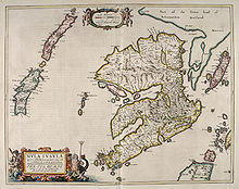 Ulva came into the possession of the Clan MacQuarrie (an anglicised version of the surname MacGuaire[3][24]) family over a thousand years ago, and they controlled it until the mid-19th century. The name MacGuaire is also anglicised as McGuire in Ireland. The English version has many variants, for examples, a 16th-century clan chief was Donn-slèibhe MacGuaire, possibly the ancestor of the Livingstone (MacDhùn-lèibhe) family. MacKenzie mentions that his name was anglicised in the following widely differing versions - "Dunslavie McVoirich" (either MacMhuirich (which becomes Currie or MacPherson) or MacMhurchaidh), "Dulleis MacKwiddy", "Dwnsleif MacKcurra" and "Dwnsleyf MaKwra".[3] "Dunslav" was recorded as a forename in Ulva in 1693 as well.[25]
