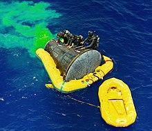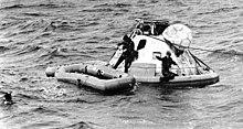 Initially, the splashdown of U.S. manned space capsules were unassisted.[48]That changed quickly after the second manned flight. When Mercury 11 hit the water the hatch blew and she sank nearly drowning Gus Grissom. After that all Mercury, Gemini, and Apollo space capsules were met by UDTs 11 or 12 upon splashdown. Before the hatch was opened the UDTs would attach a flotation collar to the capsule and liferaft for the astronauts to safely exit the craft.[48]