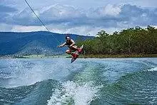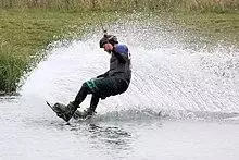 When wakeboarding, a variety of tricks may be attempted. Most of these stem from the wakeboarder adjusting their posture, edge, and distribution of weight so as to fly into the air upon hitting the wake.[12] Various tricks include the toeside edge,[12] the heelside edge,[13] the ride switch,[14] and the 180° spin.[15]