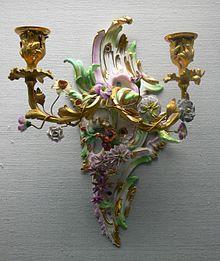Sconces can be placed on both the interior and exterior walls of buildings. In pre-modern usage, these usually held candles and torches respectively. Historically, candle sconces were often made of silver or brass from the 17th century, with porcelain and ormolu coming into use during the 18th century. The light of the candle flame was often intensified by a reflecting backplate. Using brackets, the candle would be kept at safe distance from the wall.[2]