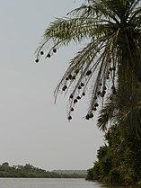 Spherical village weaver nests suspended from a palm tree, West Africa
