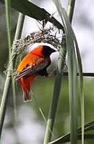 | A male village weaver (Ploceus cucullatus bohndorffi), building his nest | |