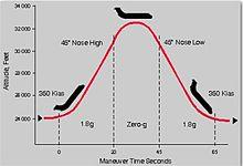 To create a weightless environment, the airplane flies in a six-mile long parabolic arc, first climbing, then entering a powered dive. During the arc, the propulsion and steering of the aircraft are controlled such that the drag (air resistance) on the plane is cancelled out, leaving the plane to behave as it would if it were free-falling in a vacuum. During this period, the plane's occupants experience 22 seconds of weightlessness, before experiencing about 22 seconds of 1.8 g acceleration (nearly twice their normal weight) during the pull-out from the parabola. A typical flight lasts around two hours, during which 30 parabolae are flown.