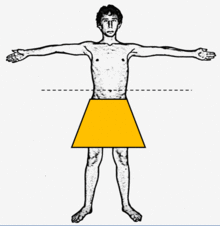 Because of the distribution of mass throughout a person's body, the magnitude of the reaction force varies between a person's feet and head. At any horizontal cross-section of a person's body (as with any column), the size of the compressive force being resisted by the tissues below the cross-section is equal to the weight of the portion of the body above the cross-section. In the pose adopted in the accompanying illustration, the shoulders carry the weight of the outstretched arms and are subject to a considerable torque.