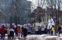 On 30 January 2015, the Supreme Court of Canada ruled that there is a constitutional right to strike.[23] In this 5–2 majority decision, Justice Rosalie Abella ruled that "[a]long with their right to associate, speak through a bargaining representative of their choice, and bargain collectively with their employer through that representative, the right of employees to strike is vital to protecting the meaningful process of collective bargaining..." [paragraph 24]. This decision adopted the dissent by Chief Justice Brian Dickson in a 1987 Supreme Court ruling on a reference case brought by the province of Alberta. The exact scope of this right to strike remains unclear.[24] Prior to this Supreme Court decision, the federal and provincial governments had the ability to introduce "back to work legislation", a special law that blocks the strike action (or a lockout) from happening or continuing. Canadian governments could also have imposed binding arbitration or a new contract on the disputing parties. Back to work legislation was first used in 1950 during a railway strike, and as of 2012 had been used 33 times by the federal government for those parts of the economy that are regulated federally (grain handling, rail and air travel, and the postal service), and in more cases provincially. In addition, certain parts of the economy can be proclaimed "essential services" in which case all strikes are illegal.[25]