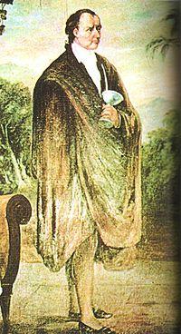 Lithograph of José Gaspar Rodríguez de Francia, a 19th-century ruler of Paraguay, holding a mate and bombilla