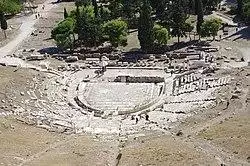 The seeds of Greek drama were sowed in religious festivals for the gods, chiefly Dionysus, the god of wine.[14] During Aeschylus' lifetime, dramatic competitions became part of the City Dionysia, held in spring.[14] The festival opened with a procession which was followed by a competition of boys singing dithyrambs, and all culminated in a pair of dramatic competitions.[28] The first competition Aeschylus would have participated in involved three playwrights each presenting three tragedies and one satyr play.[28] Such format is called a continuous tragic tetralogy. It allowed Aeschylus to explore the human and theological and cosmic dimensions of a mythic sequence, developing it in successive phases.[29] A second competition involving five comedic playwrights followed, and the winners of both competitions were chosen by a panel of judges.[28]