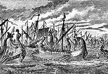 According to Herodotus, the Persian fleet initially numbered 1,207 triremes.[62] However, by his reckoning they lost approximately a third of these ships in a storm off the coast of Magnesia,[63] 200 more in a storm off the coast of Euboea,[64] and at least 50 ships to Allied action at the Battle of Artemisium.[64][65] Herodotus claims that these losses were replaced in full,[66] but only mentions 120 ships from the Greeks of Thrace and nearby islands as reinforcements.[67] Aeschylus, who fought at Salamis, also claims that he faced 1,207 warships there, of which 207 were "fast ships".[68] Diodorus[69] and Lysias[70] independently claim there were 1,200 ships in the Persian fleet assembled at Doriskos in the spring of 480 BC. The number of 1,207 (for the outset only) is also given by Ephorus,[71] while his teacher Isocrates claims there were 1,300 at Doriskos and 1,200 at Salamis.[72][73] Ctesias gives another number, 1,000 ships,[54] while Plato, speaking in general terms refers to 1,000 ships and more.[74]