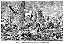 The details of the rest of the battle are generally sketchy, and no one involved would have had a view of the entire battlefield.[100] Triremes were generally armed with a large ram at the front, with which it was possible to sink an enemy ship, or at least disable it by shearing off the banks of oars on one side.[90][110] If the initial ramming was not successful, marines boarded the enemy ship and something similar to a land battle ensued.[90] Both sides had marines on their ships for this eventuality; the Greeks with fully armed hoplites;[100] the Persians probably with more lightly armed infantry.[111]