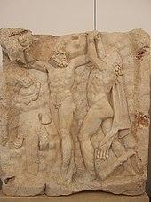 The imagery of Prometheus and the creation of man used for the purposes of the representation of the creation of Adam in biblical symbolism is also a recurrent theme in the artistic expression of late Roman antiquity. Of the relatively rare expressions found of the creation of Adam in those centuries of late Roman antiquity, one can single out the so-called "Dogma sarcophagus" of the Lateran Museum where three figures (commonly taken to represent the theological trinity) are seen in making a benediction to the new man. Another example is found where the prototype of Prometheus is also recognisable in the early Christian era of late Roman antiquity. This can be found upon a sarcophagus of the Church at Mas d'Aire[60] as well, and in an even more direct comparison to what Raggio refers to as "a coarsely carved relief from Campli (Teramo)[61] (where) the Lord sits on a throne and models the body of Adam, exactly like Prometheus." Still another such similarity is found in the example found on a Hellenistic relief presently in the Louvre in which the Lord gives life to Eve through the imposition of his two fingers on her eyes recalling the same gesture found in earlier representations of Prometheus.[58]