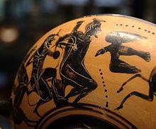 Athens was the exception, here Prometheus was worshipped alongside Athene and Hephaistos.[42] The altar of Prometheus in the grove of the Academy was the point of origin for several significant processions and other events regularly observed on the Athenian calendar. For the Panathenaic festival, arguably the most important civic festival at Athens, a torch race began at the altar, which was located outside the sacred boundary of the city, and passed through the Kerameikos, the district inhabited by potters and other artisans who regarded Prometheus and Hephaestus as patrons.[43] The race then travelled to the heart of the city, where it kindled the sacrificial fire on the altar of Athena on the Acropolis to conclude the festival.[44] These footraces took the form of relays in which teams of runners passed off a flaming torch. According to Pausanias (2nd century AD), the torch relay, called lampadedromia or lampadephoria, was first instituted at Athens in honour of Prometheus.[45]
