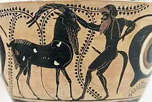 In a myth referenced in multiple classical texts, including the Bibliotheke of Pseudo-Apollodorus and the Fabulae of Pseudo-Hyginus, a satyr from Argos once attempted to rape the nymph Amymone, but she called to the god Poseidon for help and he launched his trident at the satyr, knocking him to the ground.[65][66][67] This myth may have originated from Aeschylus's lost satyr play Amymone.[65][67][68] Scenes of one or more satyrs chasing Amymone became a common trope in Greek vase paintings starting in the late fifth century BC.[67][69] Among the earliest depictions of the scene come from a bell krater in the style of the Peleus Painter from Syracuse (PEM 10, pl. 155) and a bell krater in the style of the Dinos Painter from Vienna (DM 7).[69]